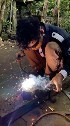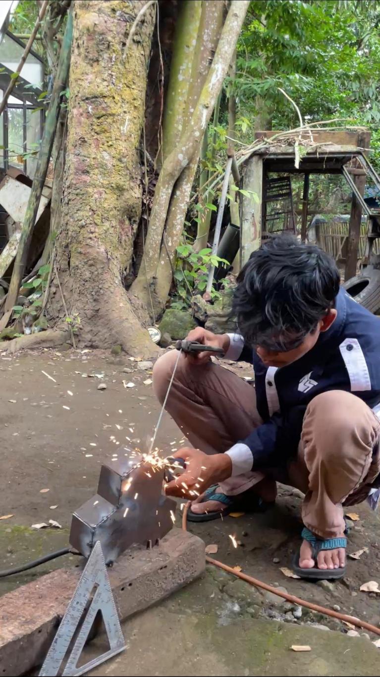 Setelah semua bagian dipotong, kegiatan dilanjutkan dengan proses pengelasan untuk menyatukan seluruh komponen cetakan paving blok. Warga yang memiliki keterampilan dalam pengelasan turut membantu dan memberikan arahan kepada mahasiswa. Mahasiswa KKN pun belajar serta terlibat langsung dalam proses tersebut, sehingga menambah wawasan dan pengalaman praktis dalam bidang konstruksi sederhana.