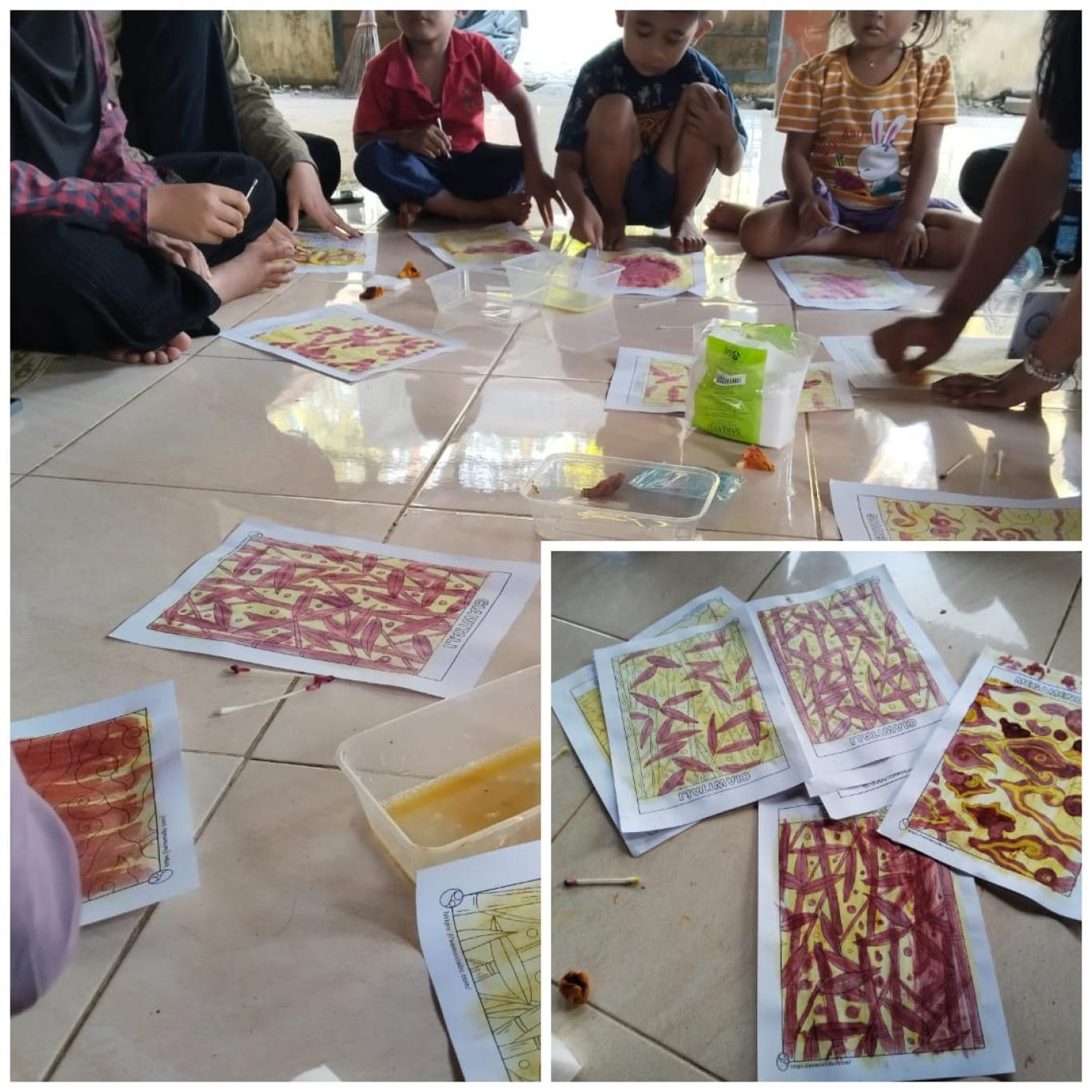 Anak-anak diajak mewarnai pola batik menggunakan bahan-bahan sederhana, yaitu larutan kunyit, deterjen (sabun), dan cuka. Bubuk kunyit yang telah dilarutkan dalam air dioleskan ke pola menggunakan kapas, menghasilkan warna dasar kuning alami.